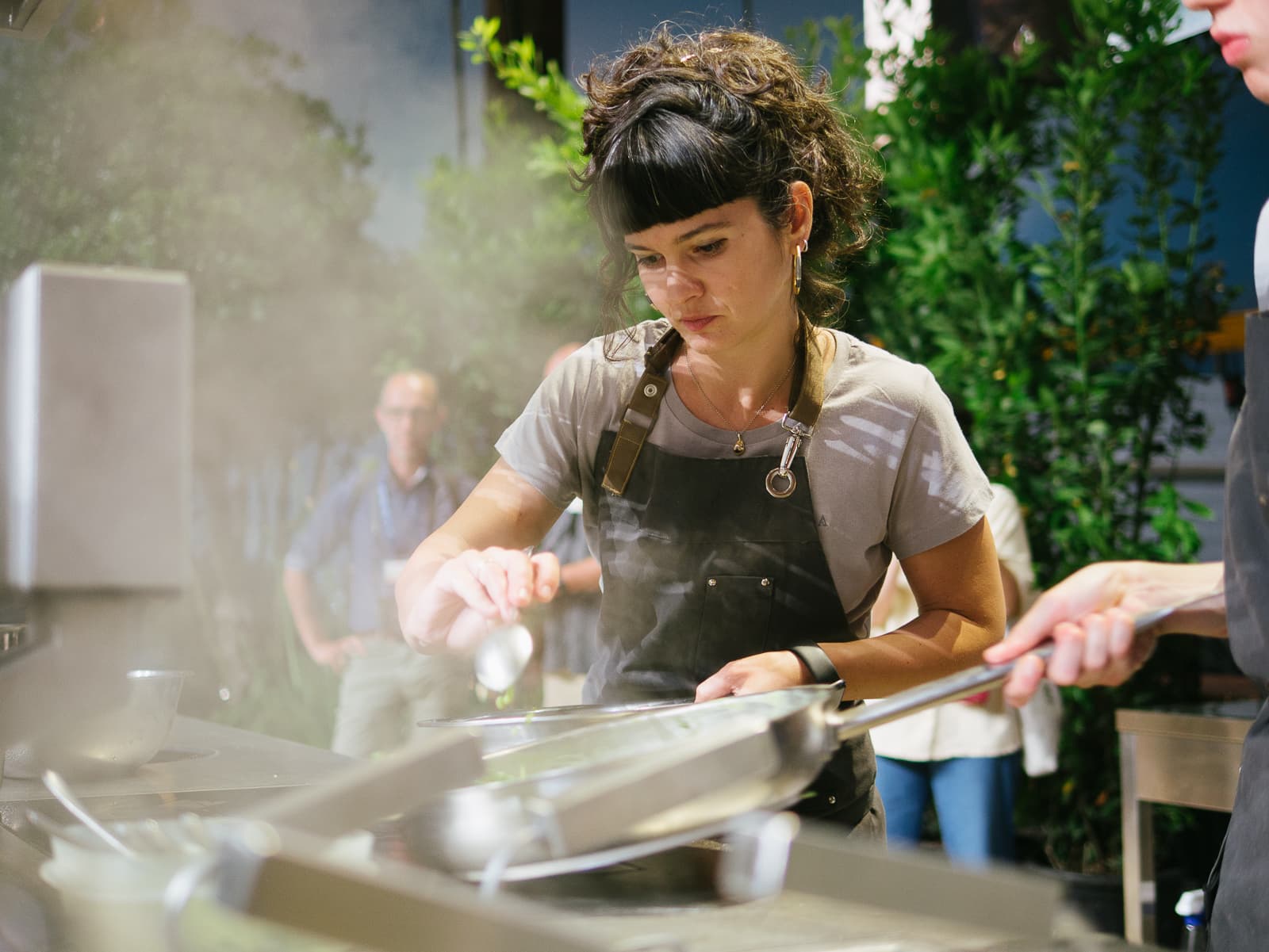 Al Mèni 2023 a Rimini, la cena del primo giorno con Chiara Pavan (Venissa – Mazzorbo), Francesco Vincenzi (Franceschetta58 – Modena), Isabelle Gemmer (Bellas Lokal – Francoforte), Marta Cerbino (Languorino – Montefiascone), Emilie Qvist e Massimiliano Mussoni (La Sangiovesa).