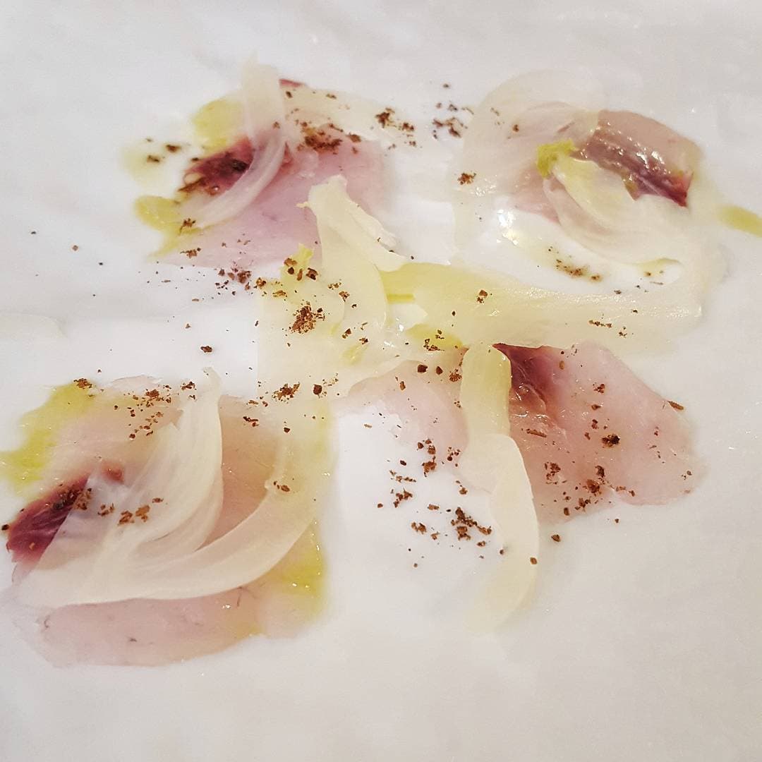Sempre per la regola del tre, lo scampo di Ponza viene riposto su una base croccante alla patata e aromatizzato all’anice. Il cefalo di fondale, la volpina, viene servito crudo accompagnato da finocchio marinato e anice stellato.