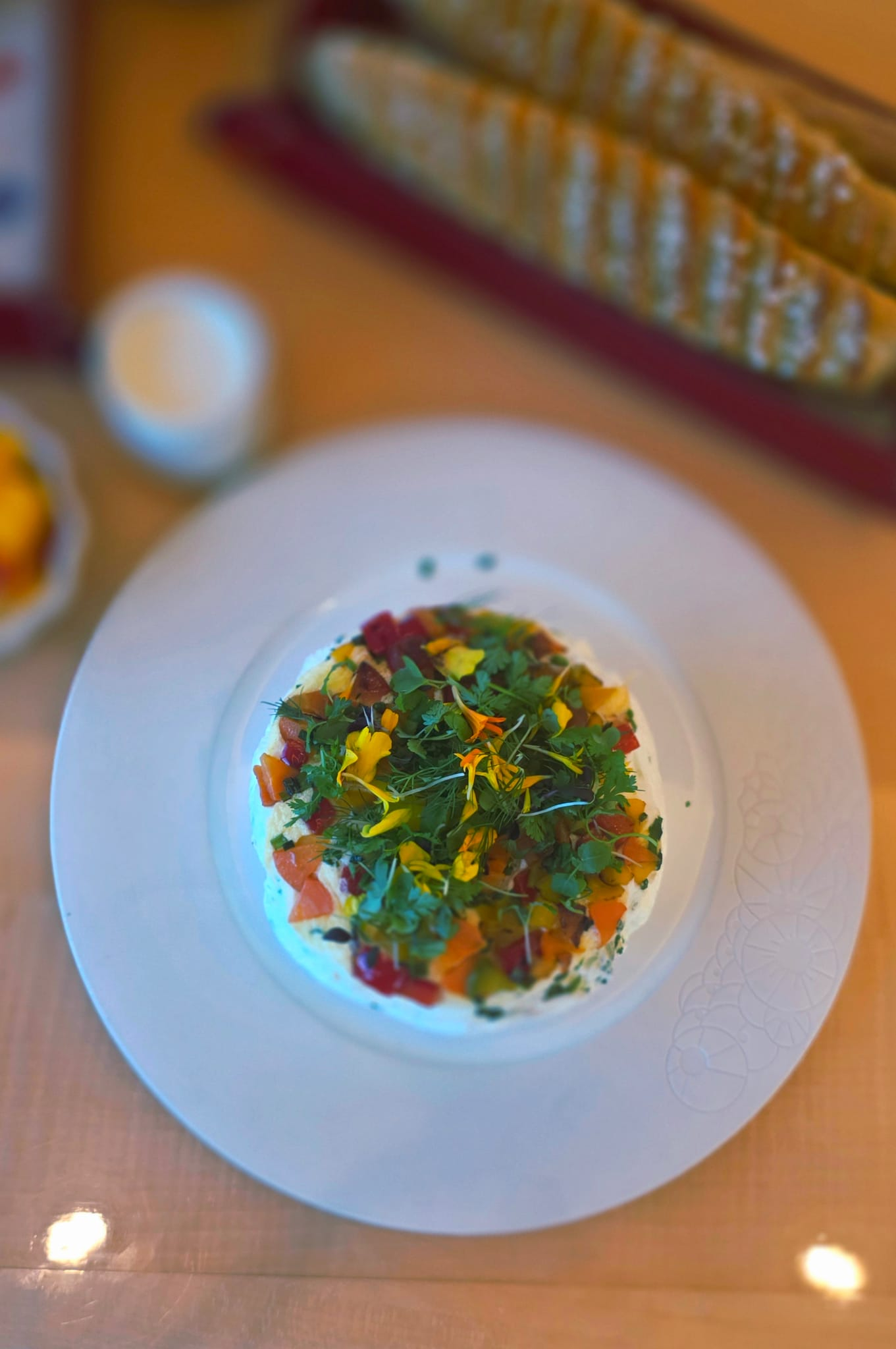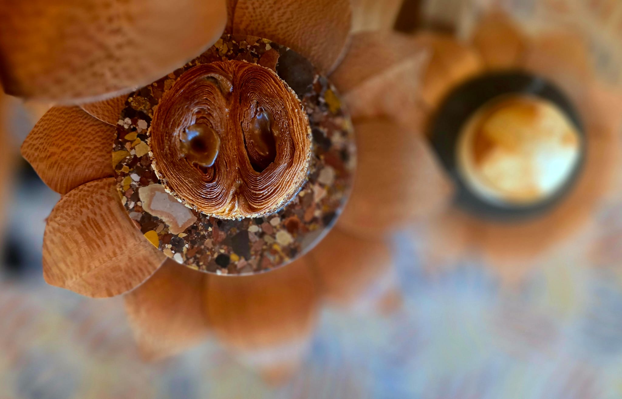 In sala, continuano a scorrere dolci del giorno e viennoiserie, esposte con cura quasi museale ; invitano a soffermarsi, catturano lo sguardo ancor prima del palato. La loro laminazione è così precisa da sembrare tracciata a mano. La trama trova una naturale evoluzione nella parte salata del menù con la scelta dell’Omelette Blanche Soufflé; una dimensione di eleganza costruita sull’aria, dove la superficie superiore evoca una terrazza vegetale. Un edificio gastronomico che vive nella precisione fondata sulla leggerezza. Non cerca l’effetto sorpresa, ma la precisione. Più che stupire, convince. Si coglie uno scarto emotivo, la sensazione è meno incisiva rispetto alla profondità della parte dolce. Ed è lì che l’esperienza trova la sua nota più alta, in quella dolcezza calibrata che continua a risuonare anche mentre il percorso prosegue. La sala accompagna il risveglio con la stessa misura, una cura simile a quella di chi si vorrebbe accanto nelle prime ore del giorno.