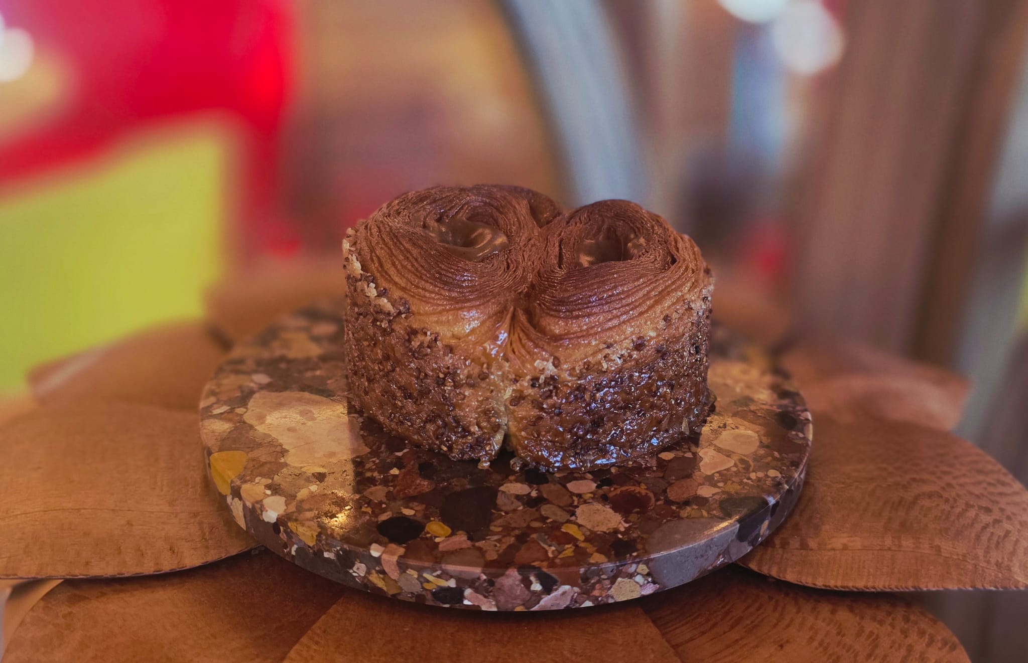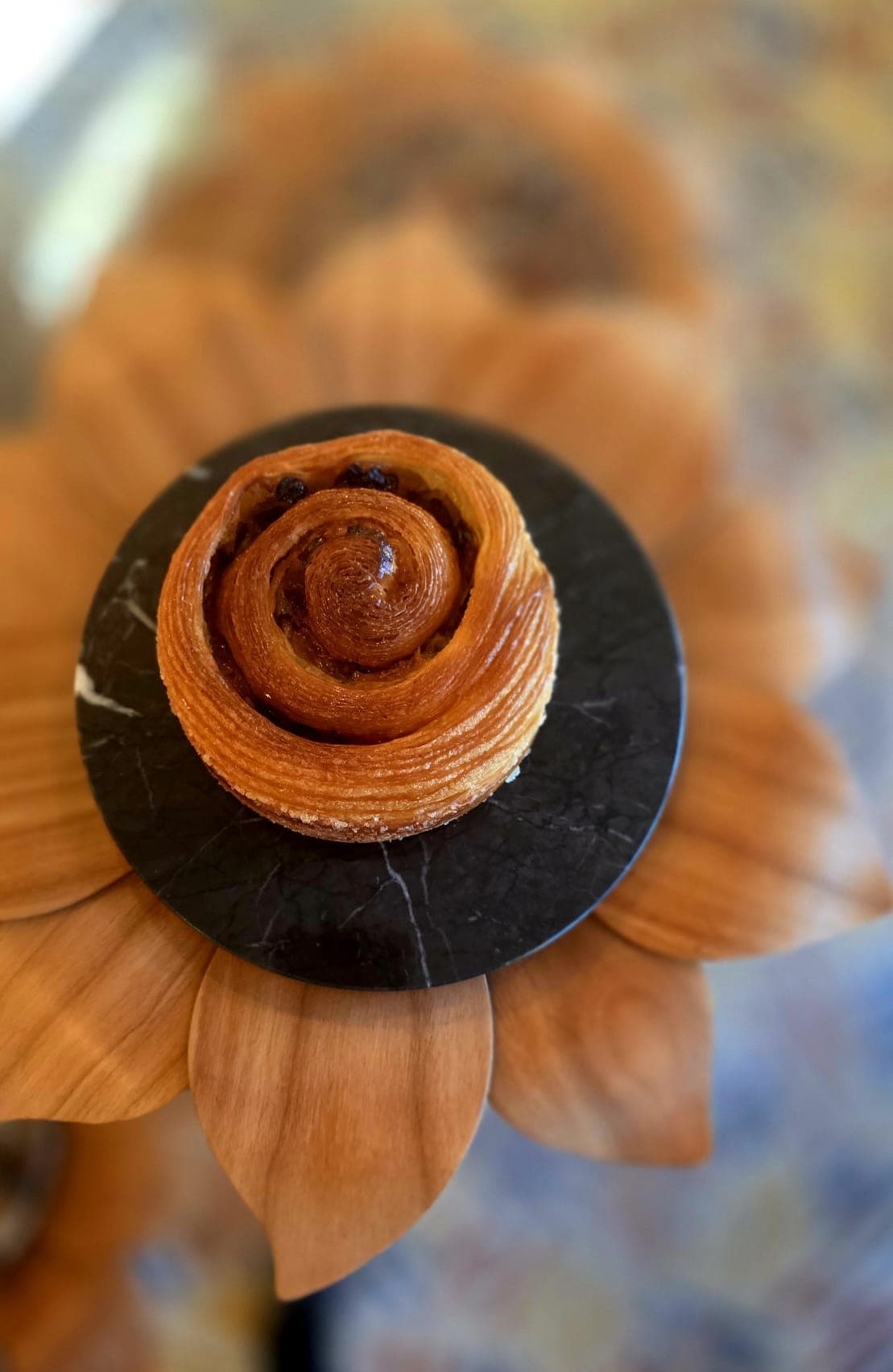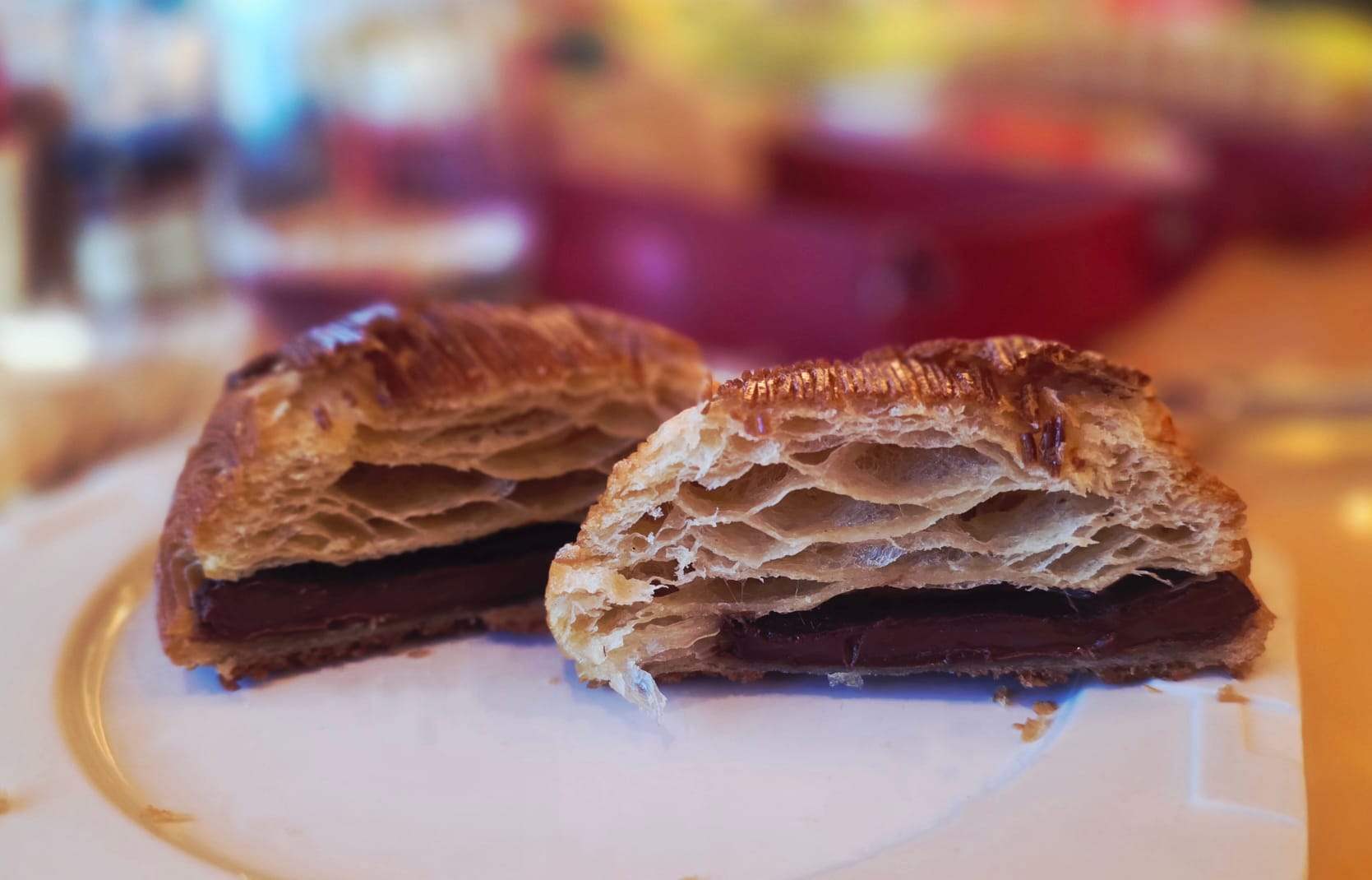 La sfogliatura si sgretola con leggerezza al primo morso rivelando la precisione del lavoro su zuccheri e burro: un equilibrio di alleggerimenti e consistenze. Il pain au chocolat è attraversato da stratificazioni precise quasi architettoniche, con il cioccolato incastonato in una base leggermente più strutturata : un contrasto tra croccantezza e morbidezza interna che culmina nella densità del cioccolato. Si avverte uno stupore inatteso.
