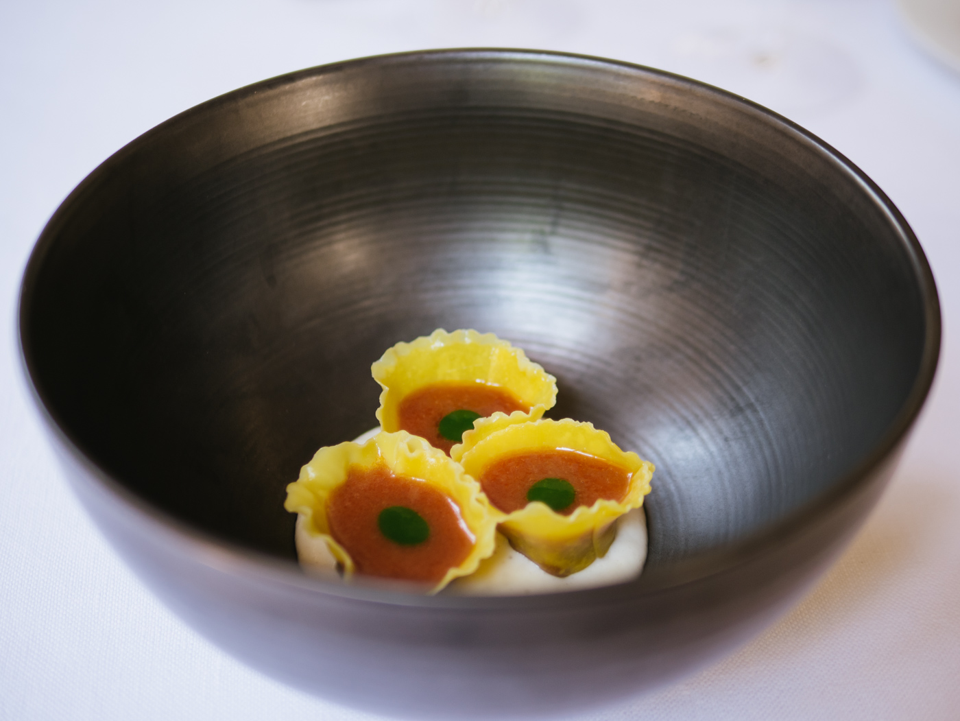 L’accoglienza è affidata a una composizione armonica di amuse-bouche, dove a una parmigiana di melanzane concentrata in una lucida sfera nera segue un macaron al pistacchio con crema di paté di fegatini. Un sorprendente ravanello marinato nell'aceto di lamponi, un taco croccante con crema di avocado, tartare di tonno e gel allo yuzu. E un cono di pasta fillo dove è custodita una crema di robiola e topinambur, tartare di spigola e liquirizia.