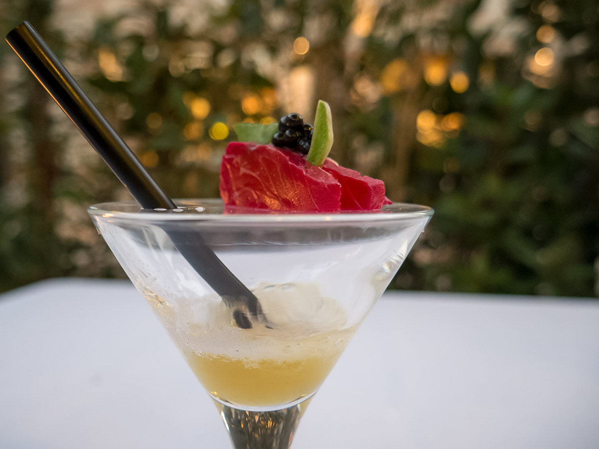 L’avvio di serata avviene all’aperto con l’aperitivo sotto le lanterne gialle della veranda di fronte all’ingresso dell’Osteria. Un’ostrica concava, si unisce all’anguria sopra una base di yogurt, con la complicità di basilico limone e caviale.