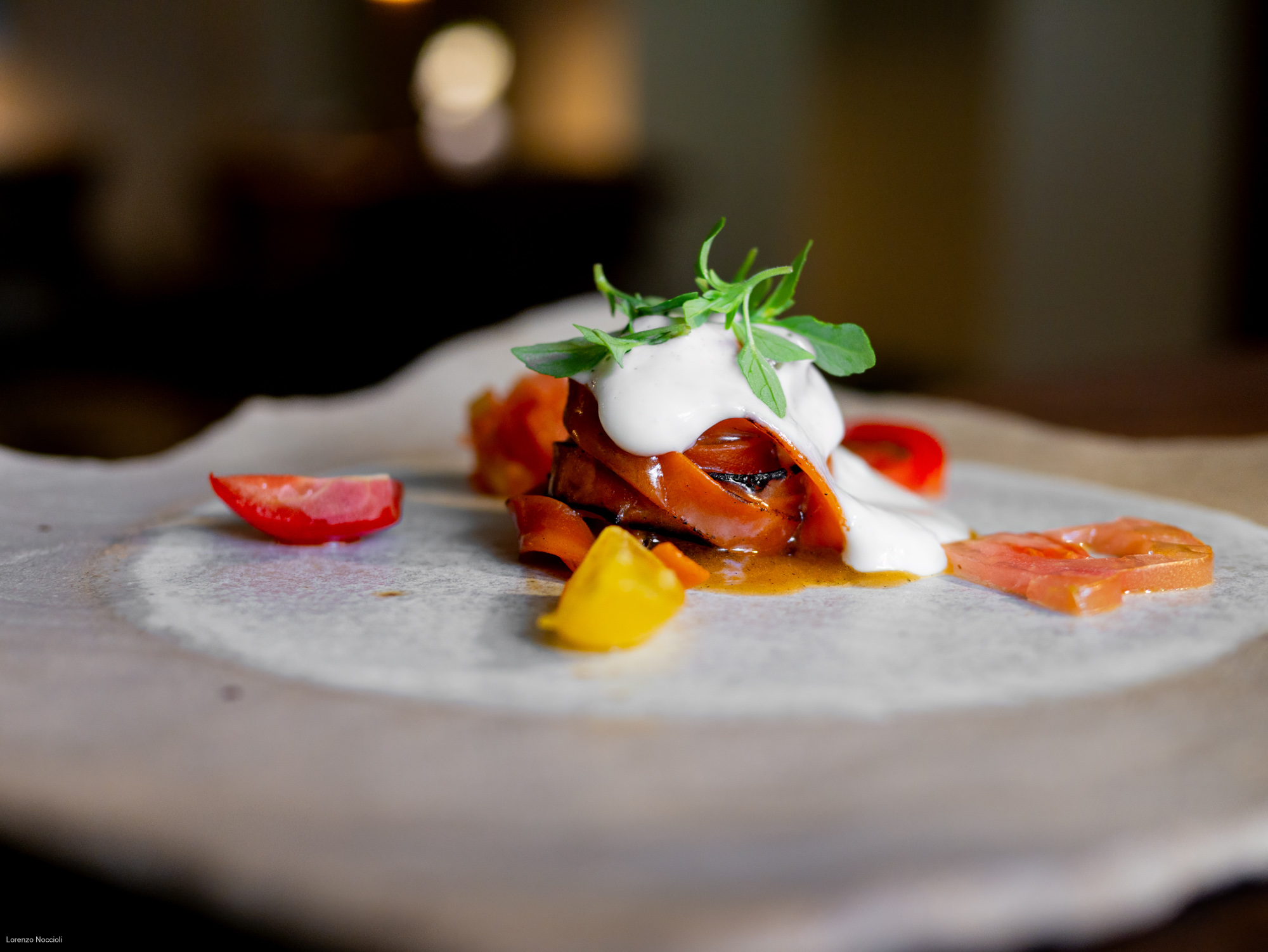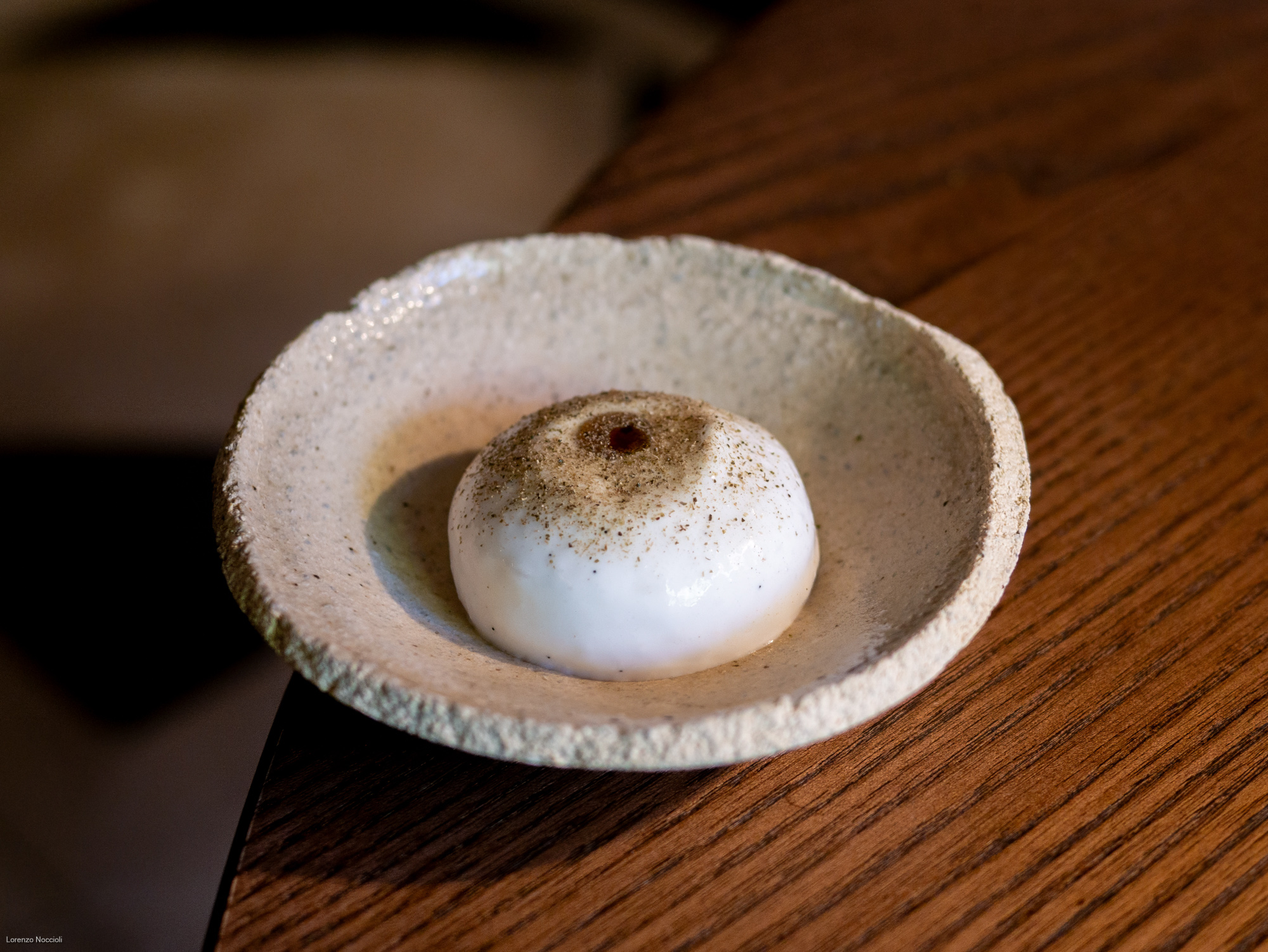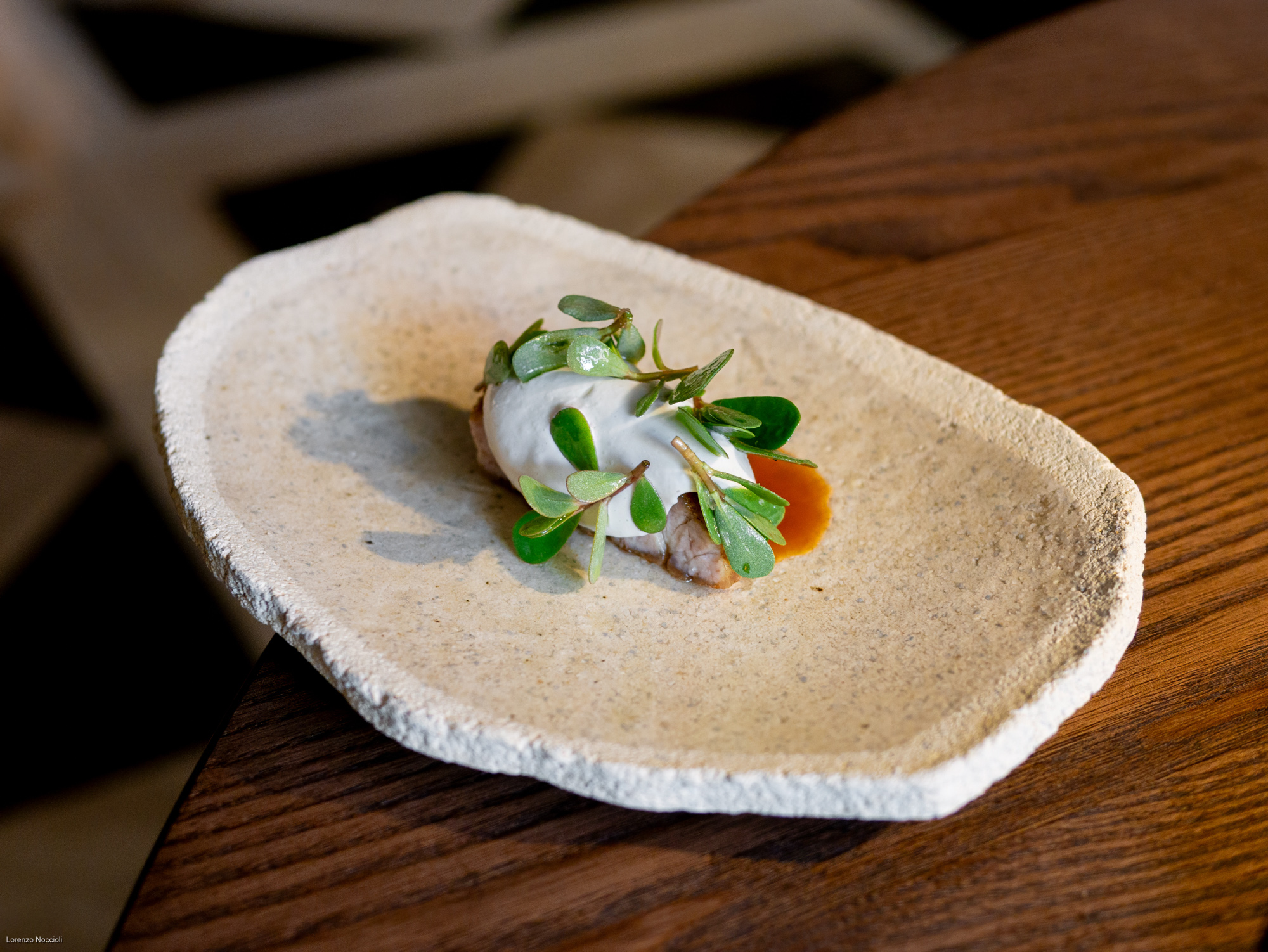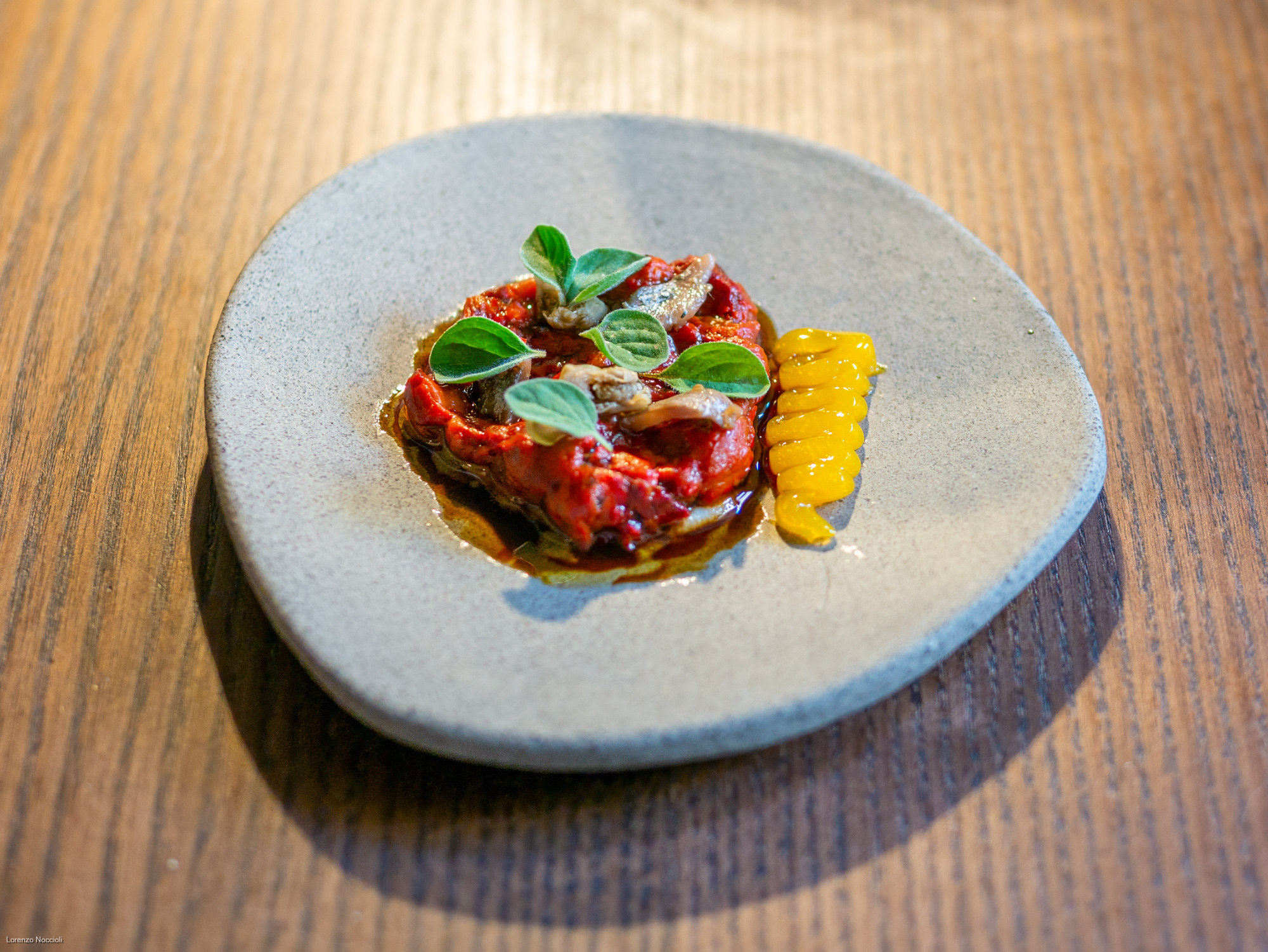 Nella parata di stuzzichini che seguono tracciano le rotte professionali dello chef, fra Milano, Roma e Asia. Il “peperone come manzo”, trattato per circa una settimana assume una consistenza carnosa, quasi di una tartare di manzo. Origano, capperi, alici di Cetara e una salsa di Parmigiano costruiscono intorno un impianto gustativo sfaccettato, mentre il tuorlo marinato lega e arrotonda. La focaccetta alla rughetta, servita a lato, restituisce una dimensione quasi domestica.