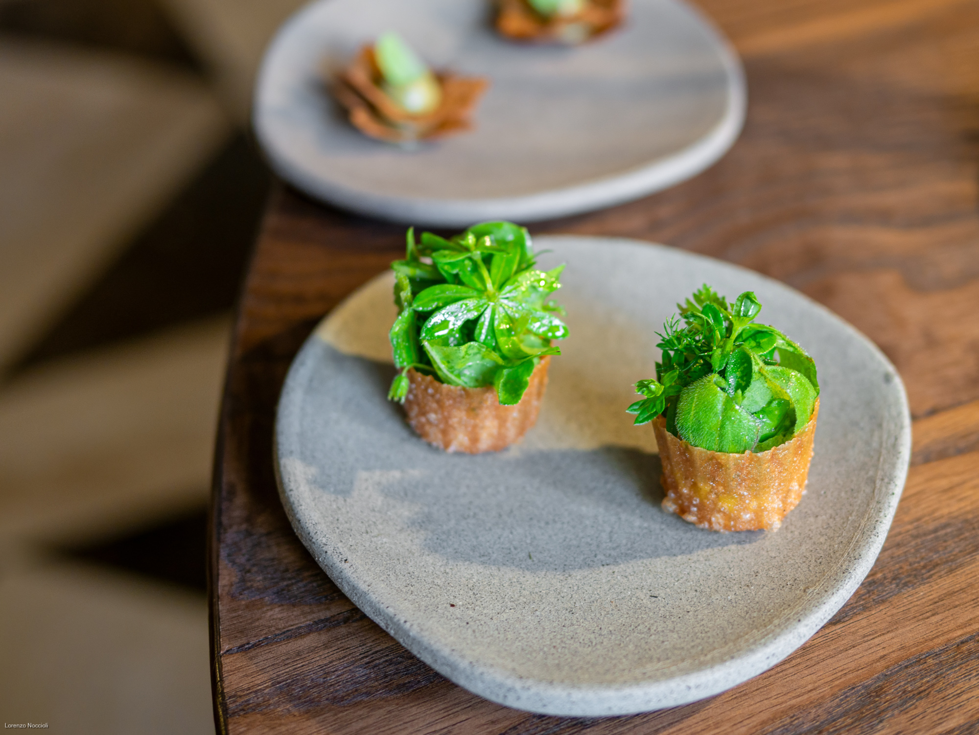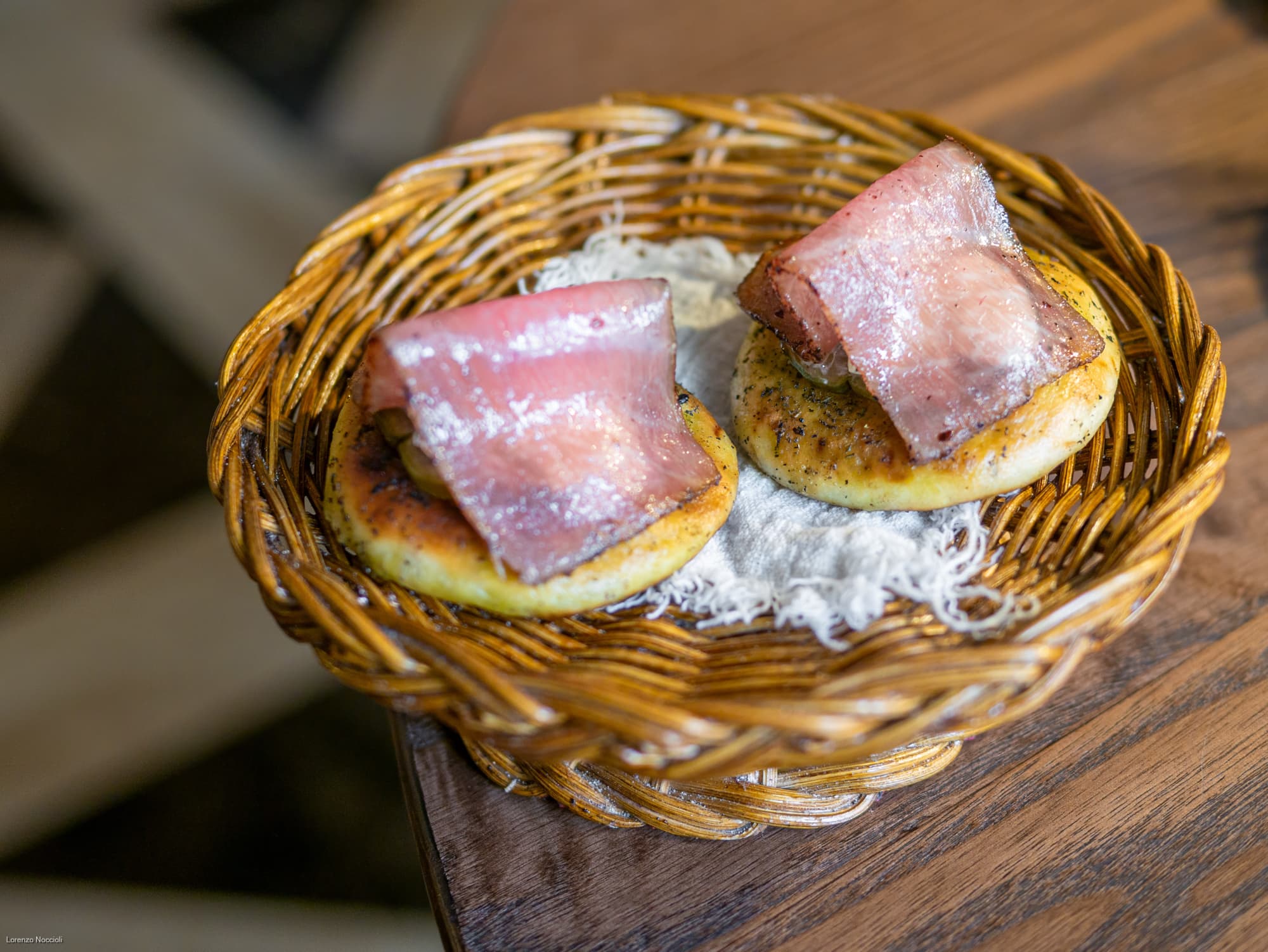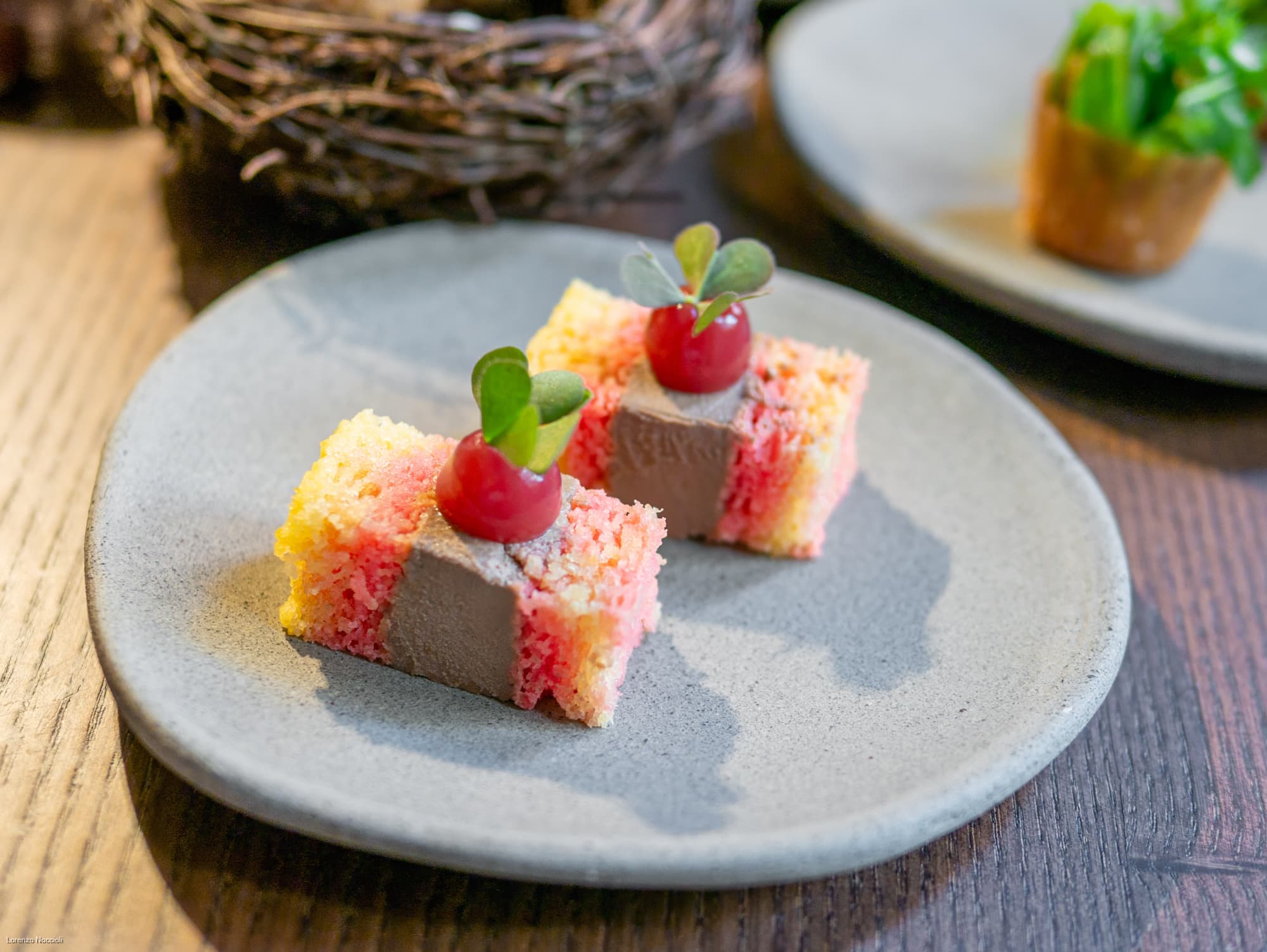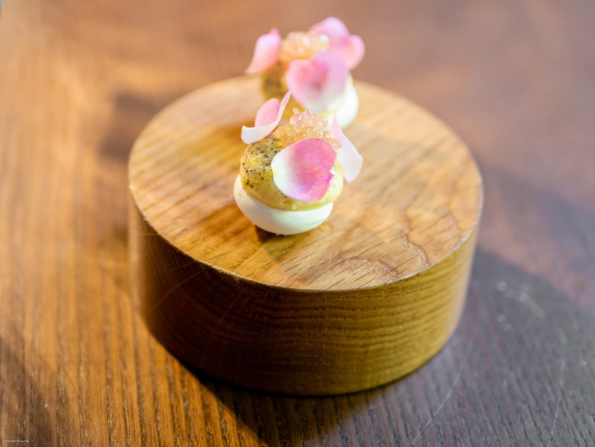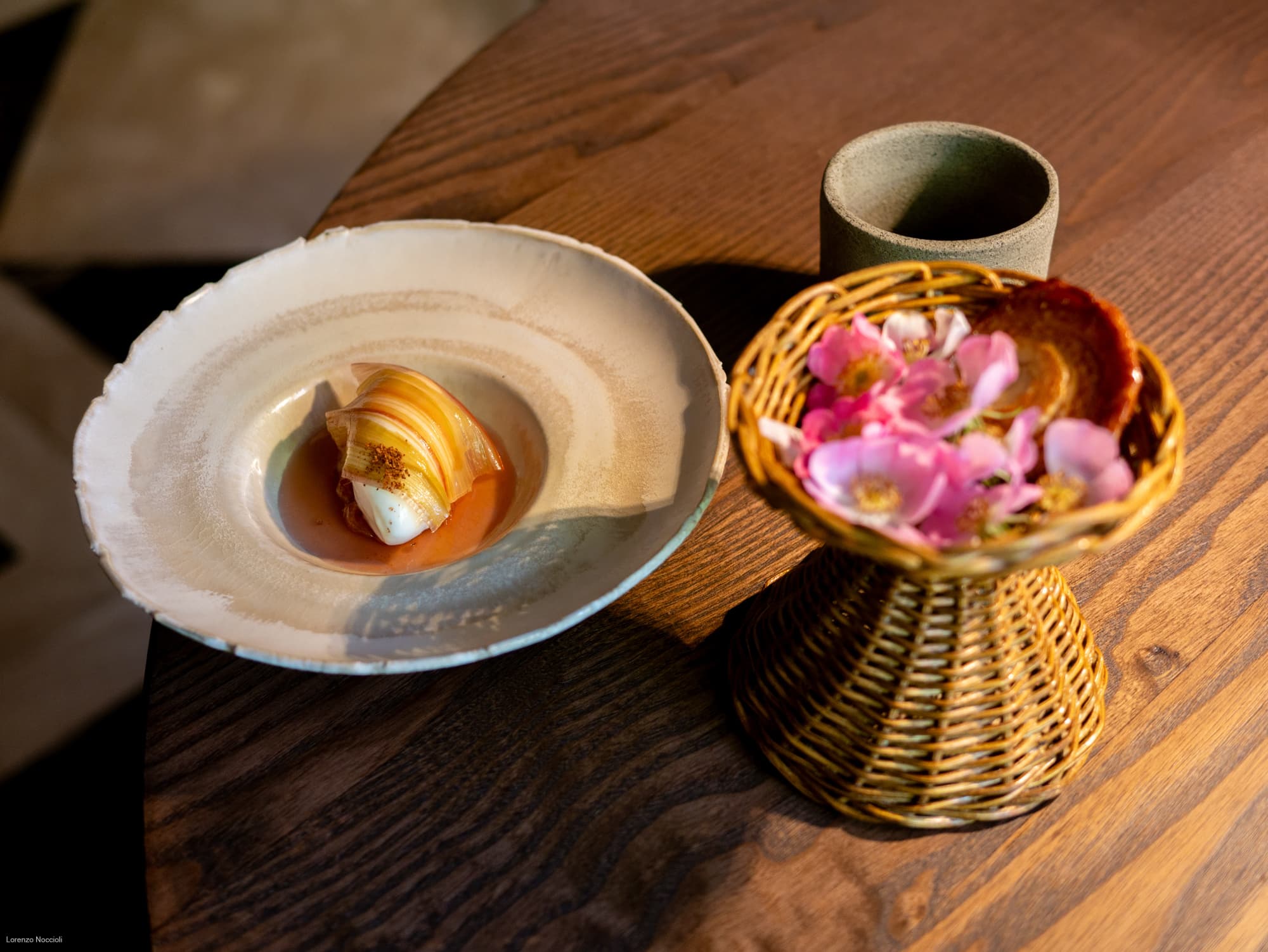 Nella parata di stuzzichini che seguono tracciano le rotte professionali dello chef, fra Milano, Roma e Asia. Il “peperone come manzo”, trattato per circa una settimana assume una consistenza carnosa, quasi di una tartare di manzo. Origano, capperi, alici di Cetara e una salsa di Parmigiano costruiscono intorno un impianto gustativo sfaccettato, mentre il tuorlo marinato lega e arrotonda. La focaccetta alla rughetta, servita a lato, restituisce una dimensione quasi domestica.