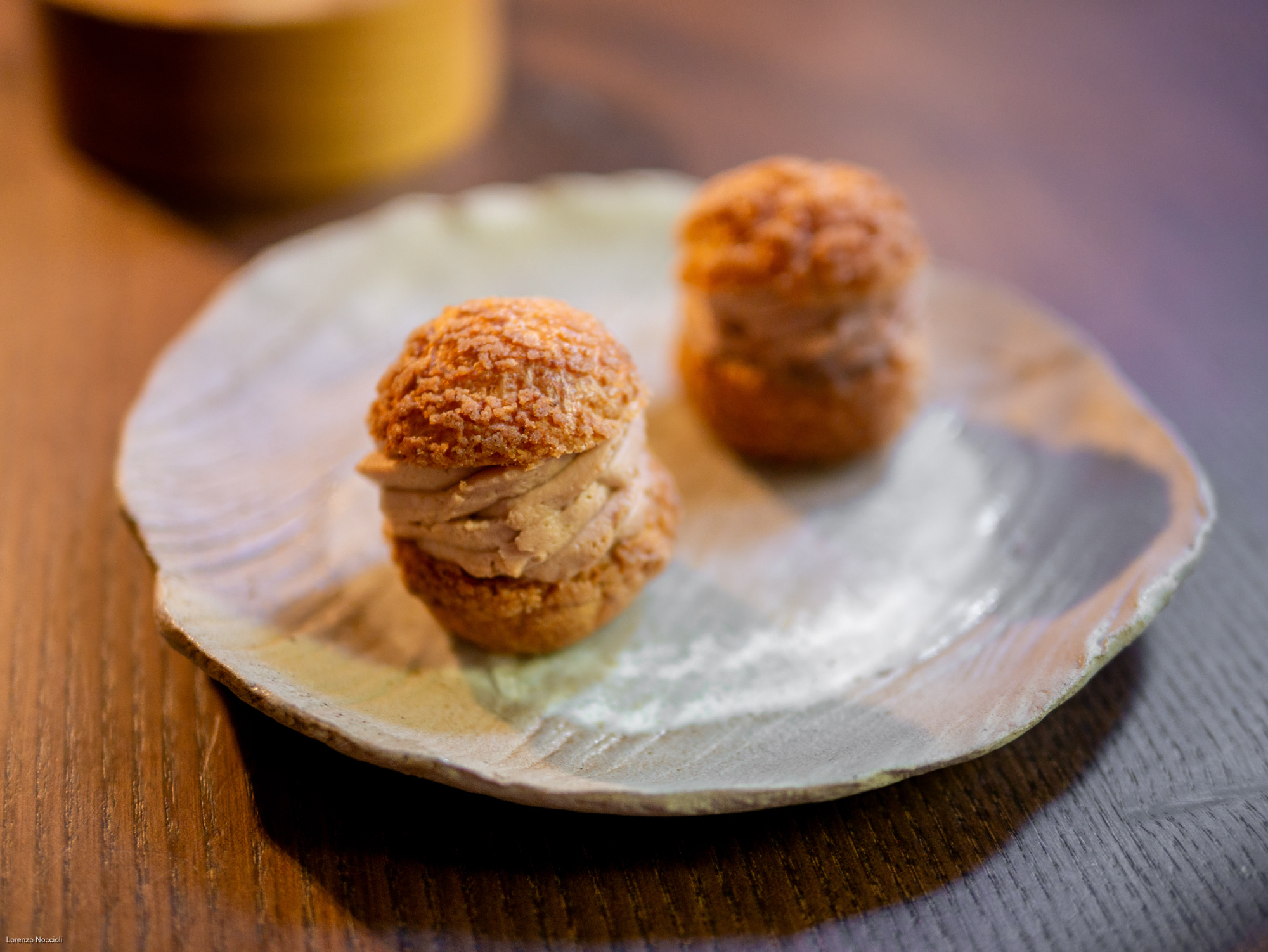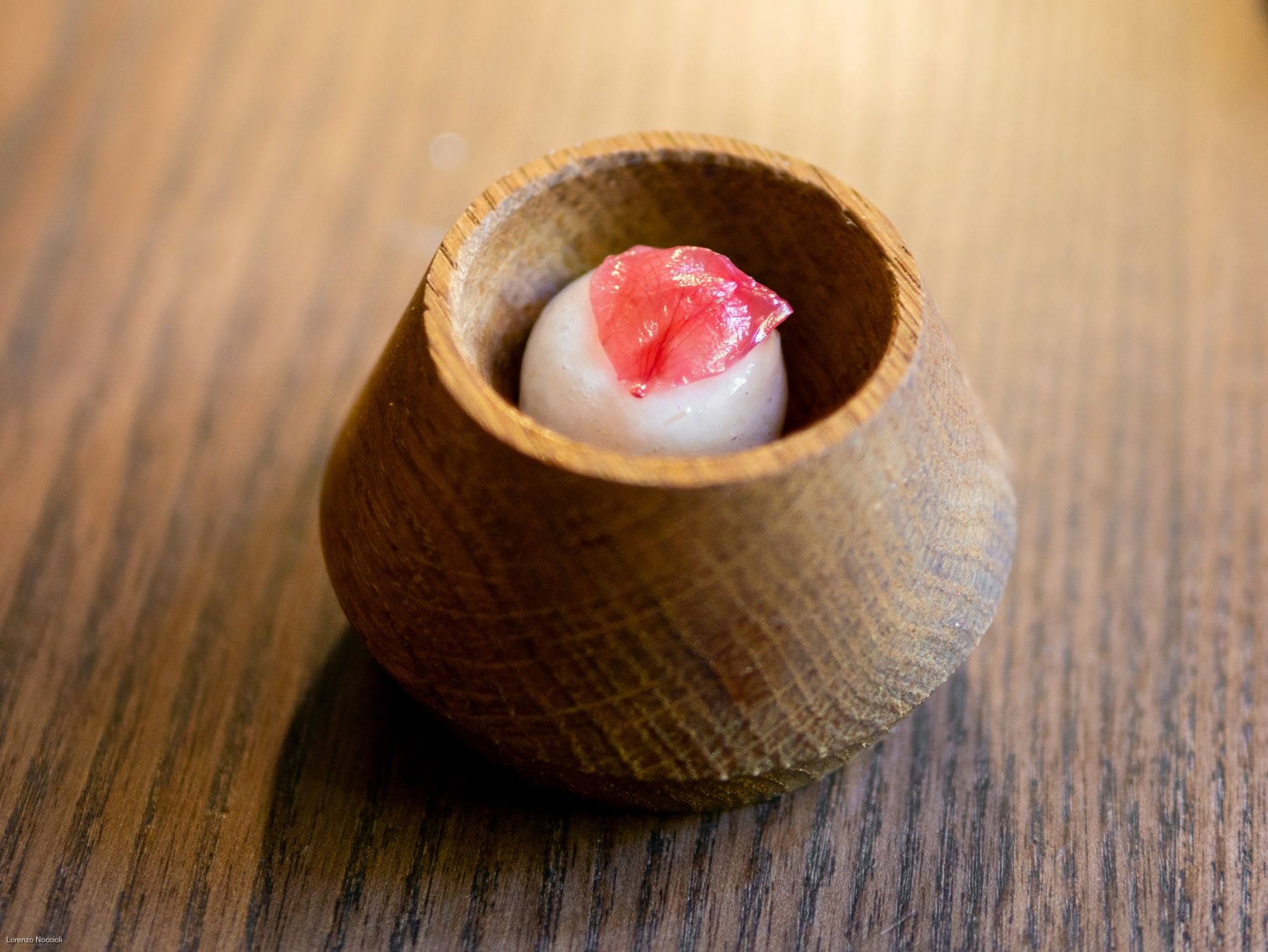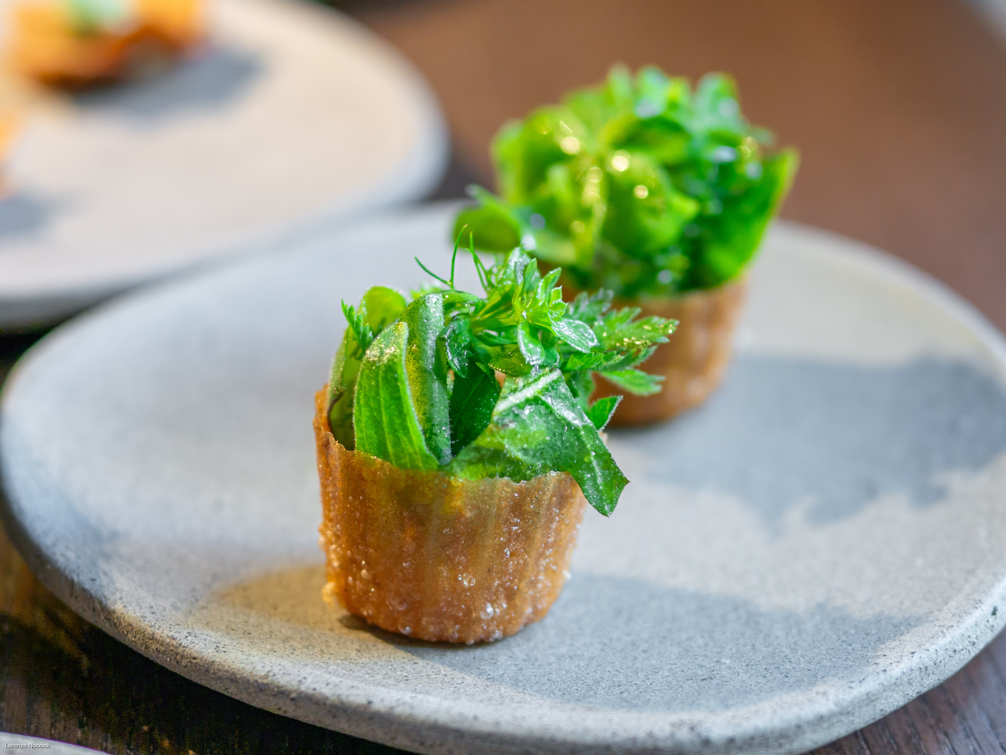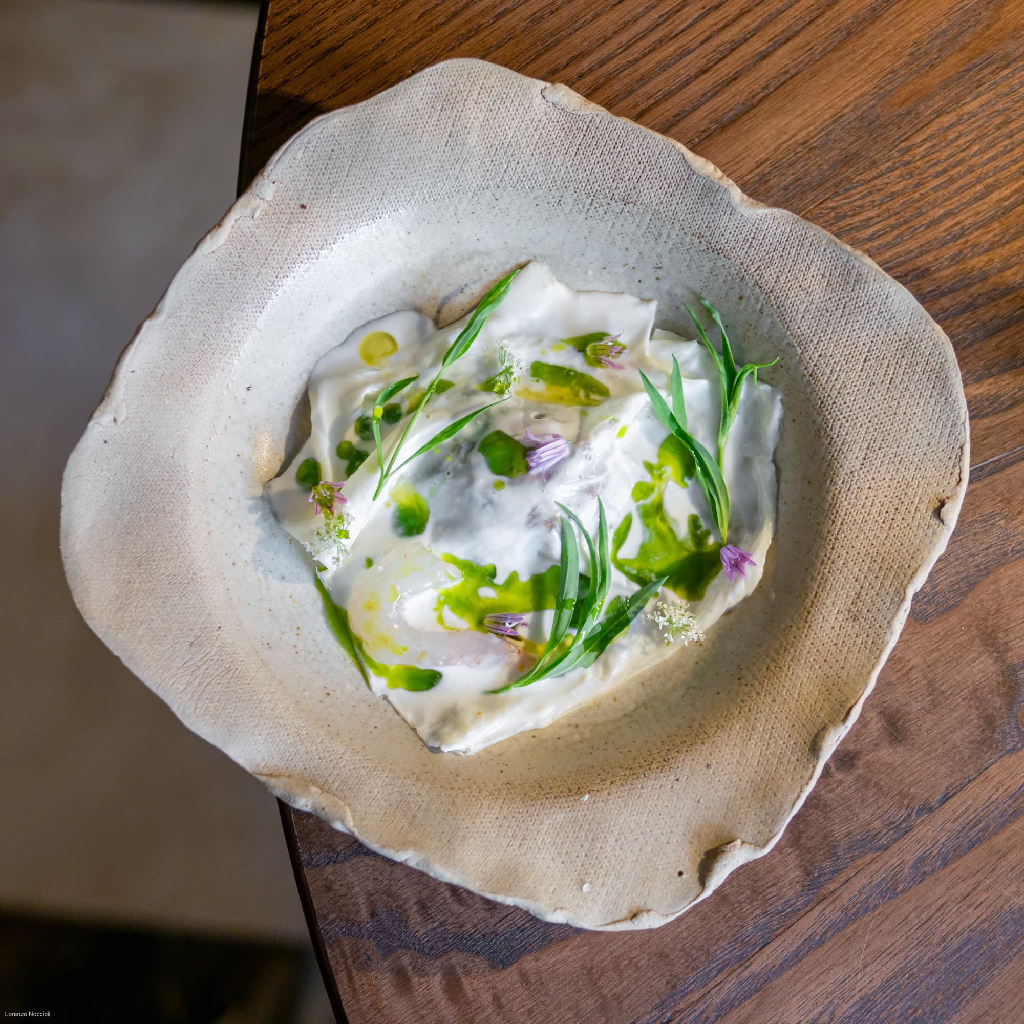 Nella parata di stuzzichini che seguono tracciano le rotte professionali dello chef, fra Milano, Roma e Asia. Il “peperone come manzo”, trattato per circa una settimana assume una consistenza carnosa, quasi di una tartare di manzo. Origano, capperi, alici di Cetara e una salsa di Parmigiano costruiscono intorno un impianto gustativo sfaccettato, mentre il tuorlo marinato lega e arrotonda. La focaccetta alla rughetta, servita a lato, restituisce una dimensione quasi domestica.