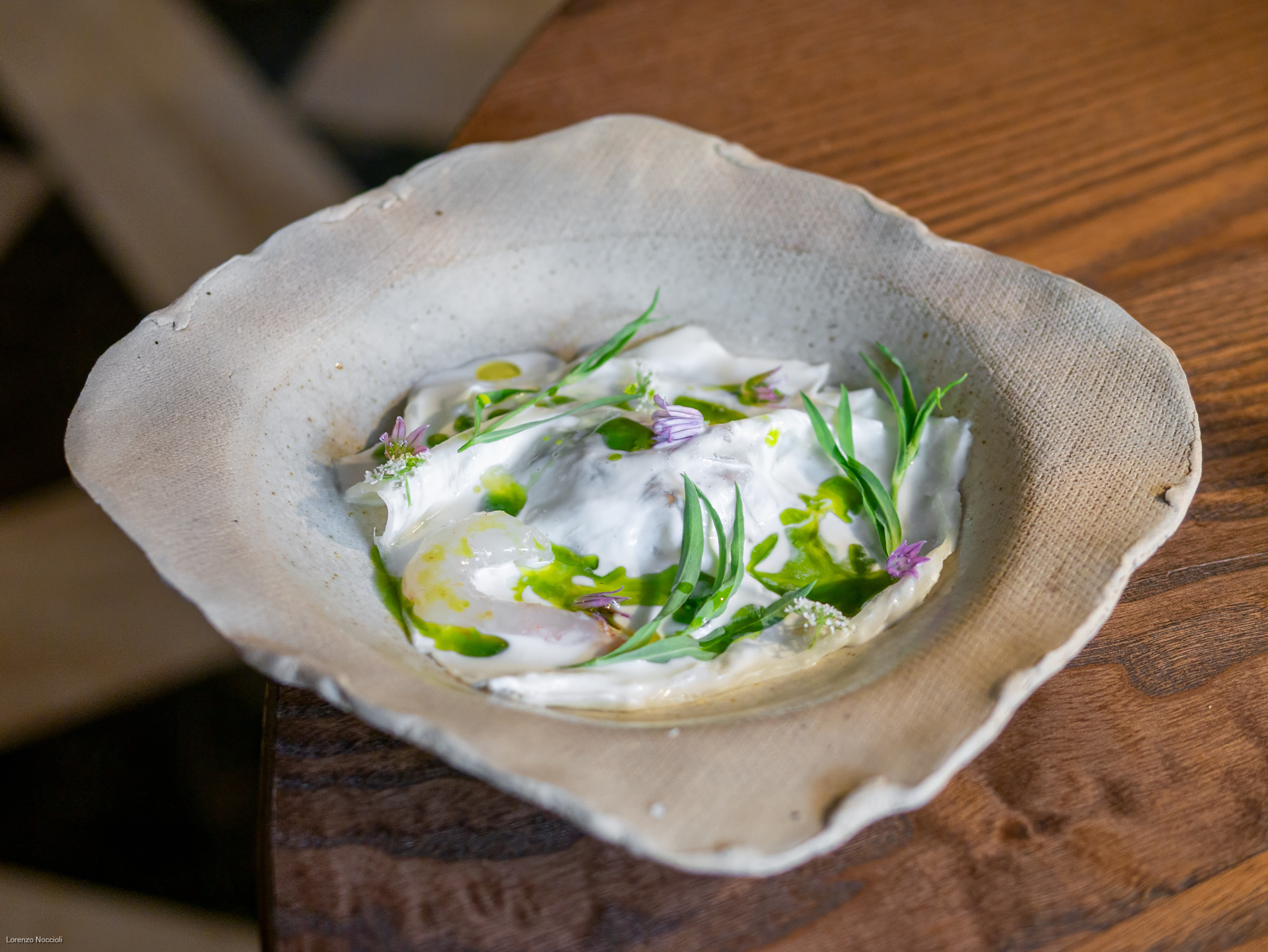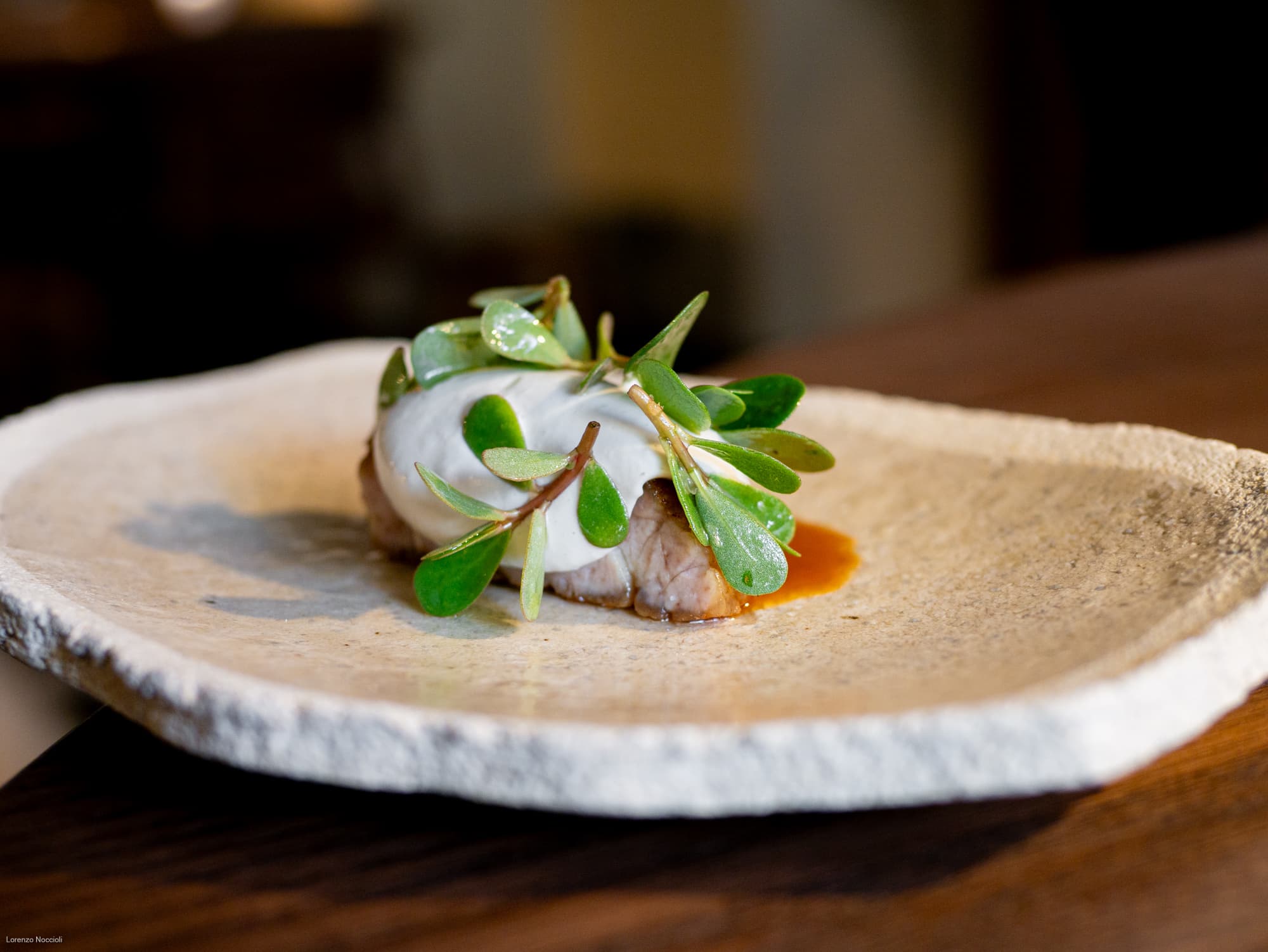 Come le ostriche alla base della maionese che avvolge di iodio appena fumé l’animella, cotta nel burro e fortificata dal fondo di manzo, striata infine dall’acidulo della portulaca.