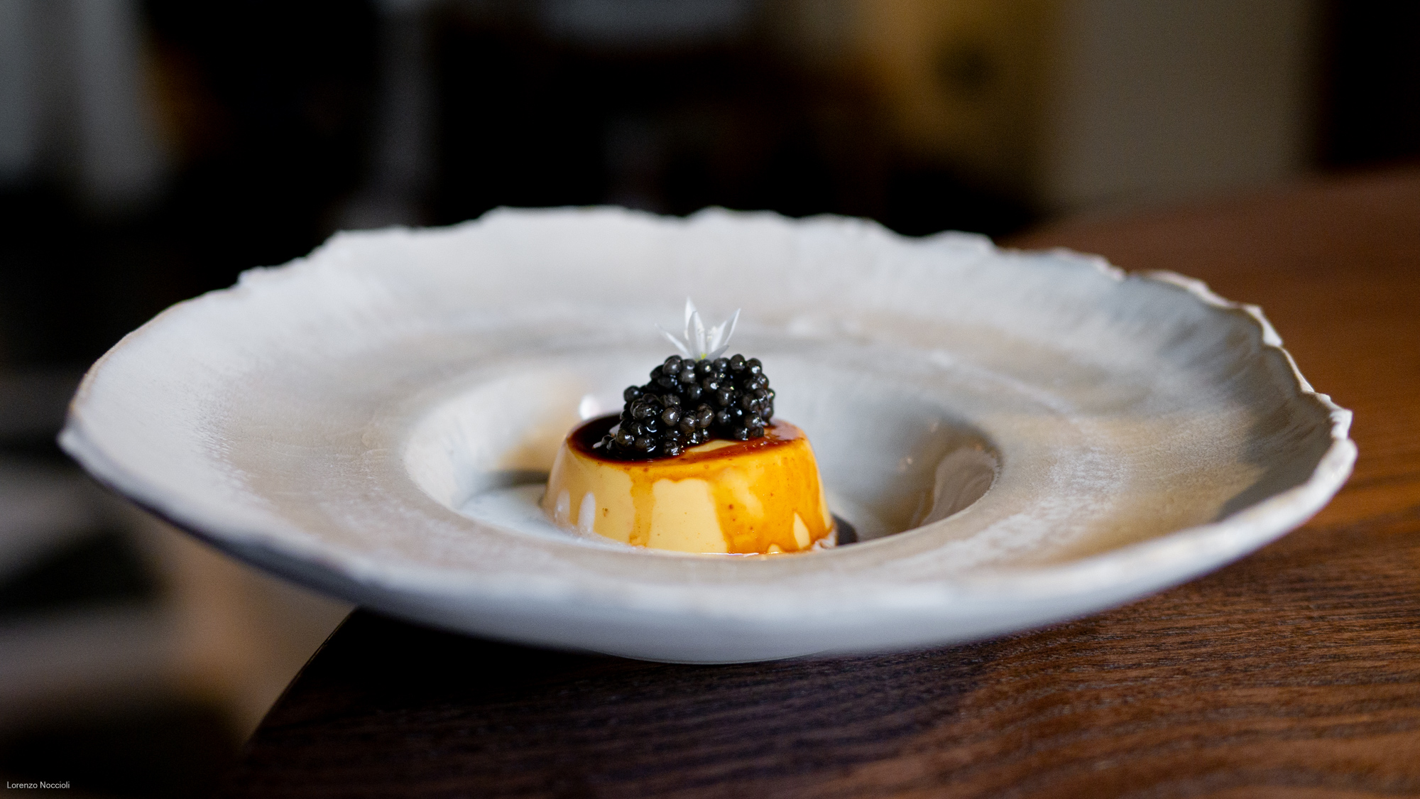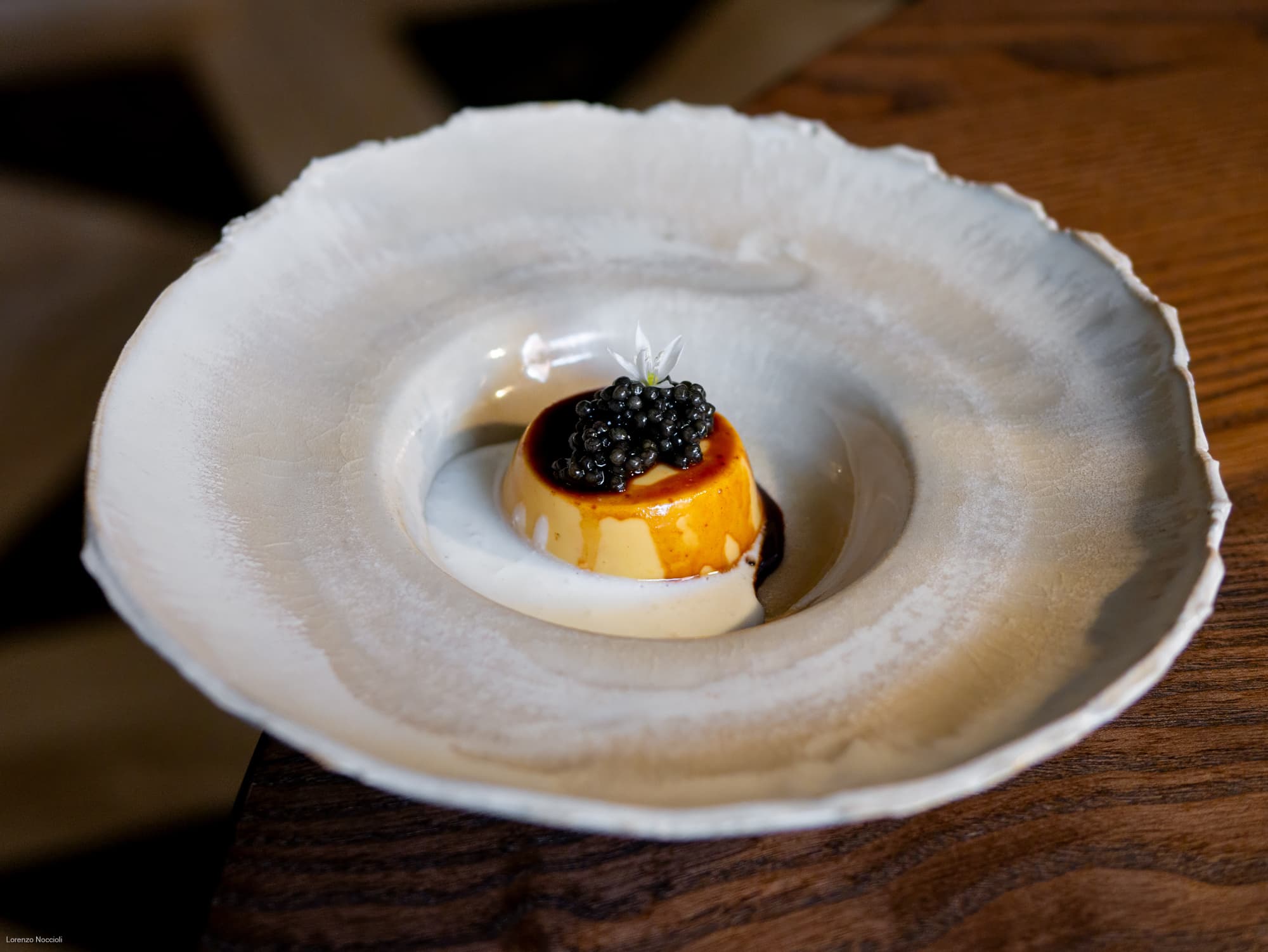 Il calembour del “cren-caramel” si estende anche al gusto, dove la dolcezza della polpa di granciporro, il caramello del suo fondo ridotto, più l’estrazione di prugne cotte viene incrinata dalla pungenza del rafano e dalla sapidità marina del caviale di storione leggermente affumicato.