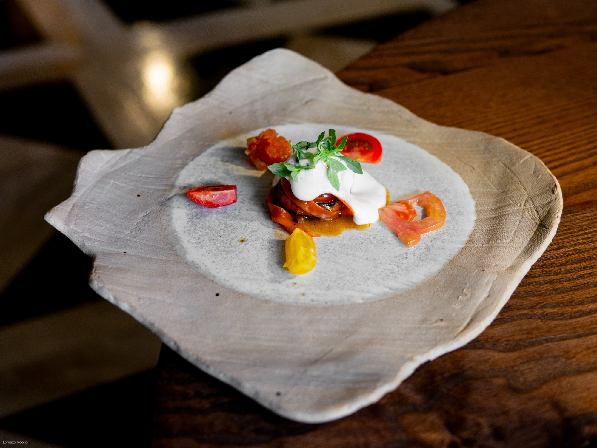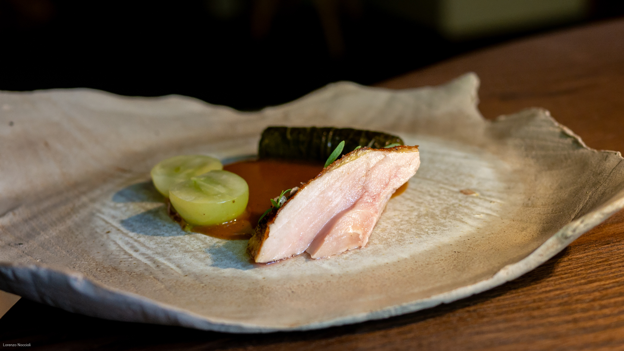 La romanità emerge nella doppia veste del carciofo, chips croccanti e una crema ottenuta da cottura sotto la cenere, dove la mentuccia romana rinfresca e riporta tutto a una classicità territoriale.