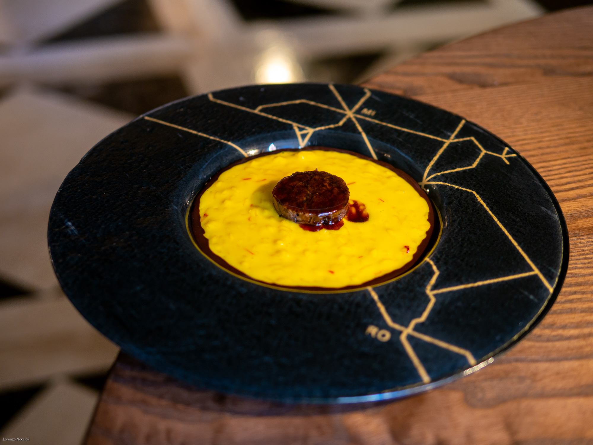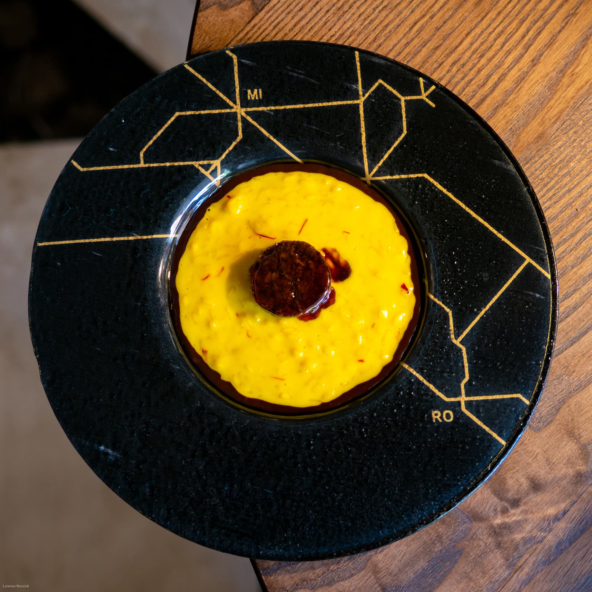 Due simboli inscalfibili della gastronomia di Milano e Roma si raccordano nel risotto Mi-Ro, il classico allo zafferano che accoglie una royale di coda, il suo fondo e una gelée di cacao amaro. Un piatto opulento e rigoroso insieme, che trova nel Syrah di Stefano Amerighi un compagno speziato e profondo.