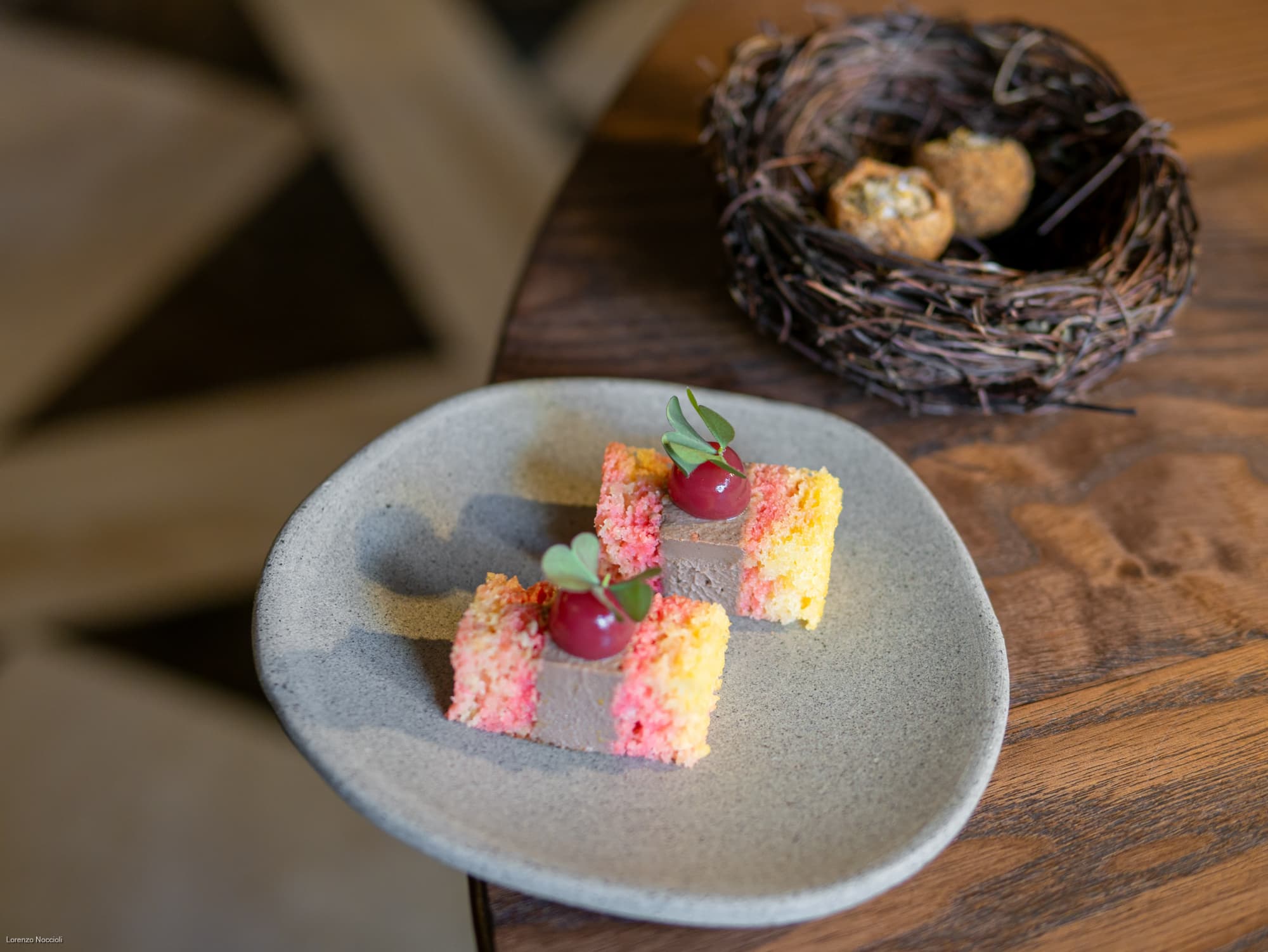 Le evocazioni asiatiche si illuminano con le Pae Ti, tartellette della gastronomia popolare con sgombro affumicato, maionese all’aneto e misticanza selvatica. Ma non mancano incursioni più dotte come i diplomatici, génoise all’alchermes, parfait di fegatini di pollo e gel di lampone.