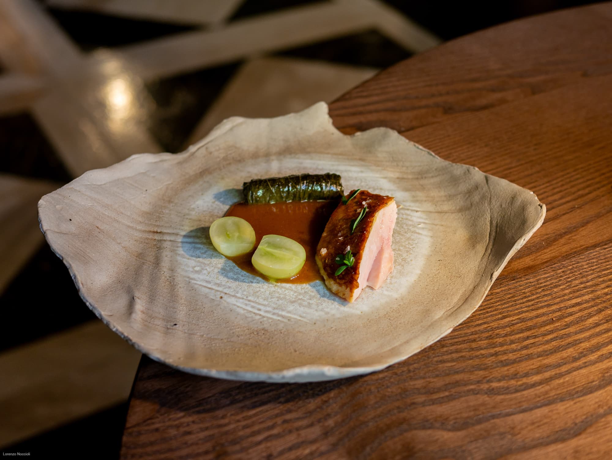 Un omaggio alla classicità romana del I secolo a.C., la faraona come Marco Gavio Apicio, il primo gastronomo romano che ha scritto un ricettario, è presentata con il petto cotto alla griglia con foglie di ruta, affiancato da acini d’uva e da un roll di foglie di vite farcito della coscia del pennuto, lardo e rosmarino.E per non uscire dall’ambientazione, un Vino Cotto stravecchio occhio di gallo scivola nel bicchiere. Tradizionalmente servito a chiusura dei banchetti dei patrizi romani e degli imperatori, citato da Plinio, è un blend di Montepulciano e Trebbiano ottenuto dalla concentrazione del mosto tramite bollitura a bassa temperatura.