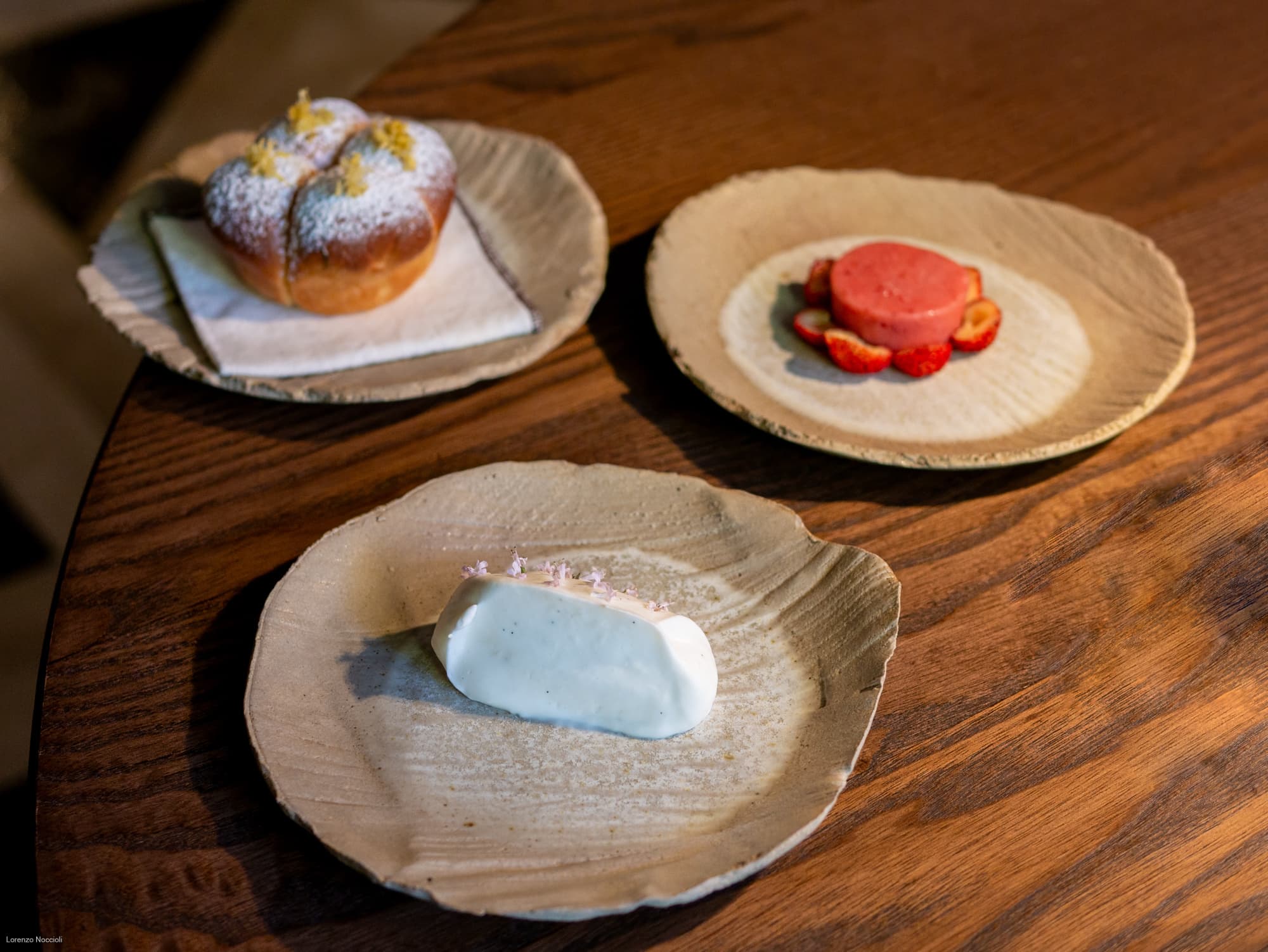 Tecnica e leggerezza convivono in modo gioviale nel rabarbaro, proposto in gel, composta, estrazione e affettato in agrodolce, accolto da un gelato alla ricotta e polvere di anice stellato, accanto a una pasta sfoglia di frangipane alla mandorla. Molto bon ton la brioche spruzzata di scorza di limone da sbocconcellare alternata a chantilly di vaniglia e sorbetto di fragoline di bosco.