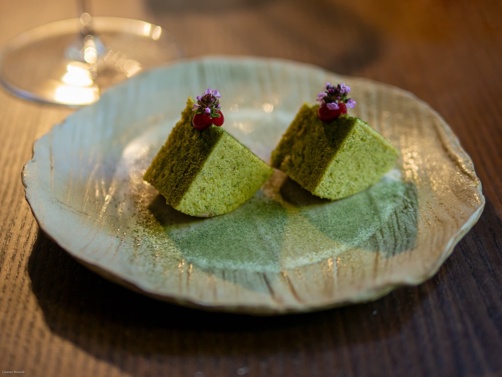 Brindisi finale con lo Champagne di sambuco, un’acqua di sambuco fermentata 4 giorni e altri 3 giorni in bottiglia, che fiancheggia le miniature finali. Opéra al pistacchio, gel di lampone, polvere di lattuga di mare. Bignè con caramello al cioccolato, banana allo zucchero moscovado. Meringa crema diplomatica al sambuco, fingerlime. Sfera di litchi e rose.